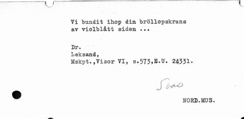//// Vi bundit ihop din bröllopskrans av violblått siden ... //// Dr. //// Leksand, //// Mskpt.,Visor VI, s.573*E.U. 24331. //// NORD.MUS. ////