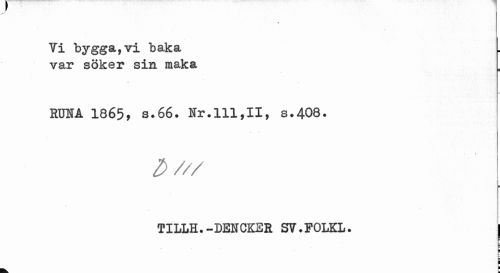 //// > //// Vi bygga,vi baka var söker sin maka //// RUHÅ 1865, s.66. Hr.111,II, s.408. //// z> /// //// TILLH.-DENCKSR SV.POLKL. I //// 9 = //// I ¦ ////