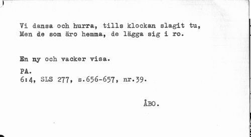 //// Vi dansa och. hurra, tills klockan slagit tu, Men de som äro hemma, de lägga sig i ro. //// En ny och vacker visa. PÅ. //// 6:4, SLS 277» s.656-657, nr.59- //// ÅBO. //// M ~ //// I //// ¦ ////