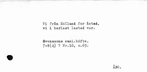 //// / //// Vi från Holland for åstad, vi i barlast lastad var. //// Svenssons såml.häfte, //// 7:8(4) ? Nr.10, s.69. //// ÅBO. ////