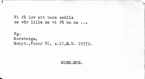 //// Vi få lov att vara snälla se vår lilla me vi få ha na ... //// Vg- //// Korsberga, //// Mskpt.,Visor VI, s.15,E.U. 22572. //// NOBD.MUS. //// l ////