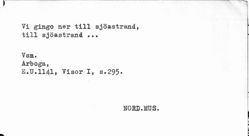 //// Vi gingo ner till sjöastrand, till sjöastrand ... //// Vsm. Arboga, //// E.U.1141, Visor I, s.295* //// t //// NORD. MUS. _ //// I //// t //// B ¦ ////