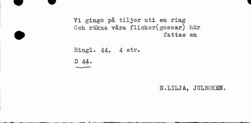 //// t //// Vi gingo på tiljor uti en ring Och räkna våra flickor(gossar) här //// en //// Ringl. 44» 4 str. //// D 44. //// H.LILJA, JULBOKEN. ////