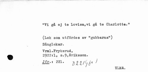 //// "Vi gå ej te Lovisa,vi gå te Charlotte." //// (Lek som utfördes av "gubbarna") //// Sånglekar. //// Vrml.Fryk erud, 2922:1, s.9,Eriksson. //// Jfr.: 221. JJJ/^i ) //// ULMA. ////