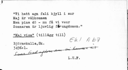 //// *Y± hatt agn fali kjyll i aur Maj är välkommen Men pina dö - nu få vi vaur Sommaren är ljuvlig f&rungdomen.11 //// »Maj visa" (tillägg till) //// tfå / 4 é>9 //// Björnekulla,Sk. 3496:1. //// L.U.F. //// ¦ //// i //// i ////