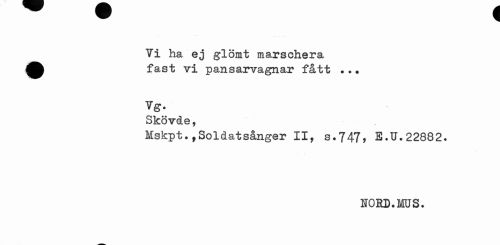 //// W 1 //// Vi ha ej glömt marschera ^^ fast vi pansarvagnar fått *.. //// Vg. //// Skövde, //// Mskpt.fSoldatsånger II, s*747, E.U.22882. //// NORD.MUS. ////