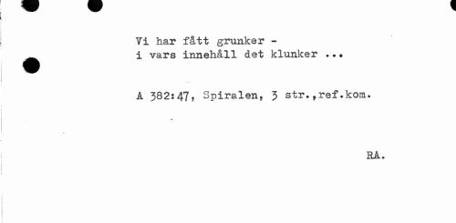 //// Yi har fått grunker -^^ i vars innehåll det klunker ... //// A 382:47, Spiralen, 3 str.,ref/kom. //// A //// RA. ////
