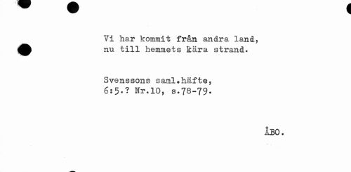 //// W 1 //// Vi har kommit från andra land, ^^ nu till hemmets kära strand. //// Svenssons saml.häfte, //// 6:5-? Nr.10, s.78-79- //// ÅBO. ////