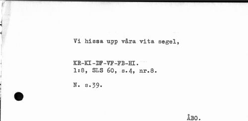 //// Yi hissa upp våra vita segel, //// KR-KI -DF-VF-FB-HI. 1:8, SLS 60, s.4, nr.8. //// N. s.39. //// ABO. ////
