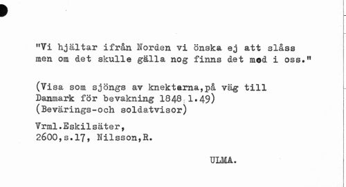 //// ¥ //// "Vi hjältar ifrån lorden vi önska ej att slåss men om det skulle gälla nog finns det mod i oss." //// (Visa som sjöngs av knektarna,på väg till Danmark för bevakning 1849;1.49) (Bevärings-och soldatvisor) //// Vrml.Eskilsäter, 2600,s.17, Nilsson,E. //// ULMA. //// i ////