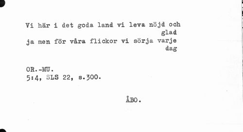 //// L \ //// i //// Vi här i det goda land vi leva nöjd och //// glad //// ja men för våra flickor vi sörja varje //// dag //// OR.-Ml. //// 5:4, SLS 22, s.300. //// " //// ÅBO. ////