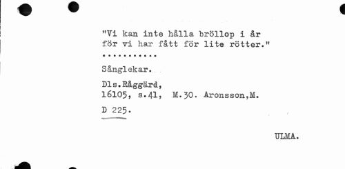 //// "Vi kan inte hålla bröllop i år för vi har fått för lite rötter." //// Sånglekar... //// 16105, s»41> M.30. Aronsson,M. D 225. //// ULMA. ////