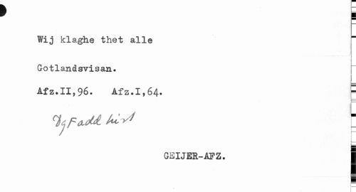 //// 9 g //// Wij klaghe thet alle Gotlandsvisan. //// Åfz.11,96. Afz.I,64. = //// % Ui yJ L //// i //// j_ //// GEIJER-ÅFZ. | //// [_ ////