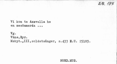 //// Vi kom te Axevalla he en mesömmerda //// Vg. //// Väne,!yr. //// Mskpt.,111,soldatsånger, s.453 E.U. 25183• //// NORD. MUS. ////