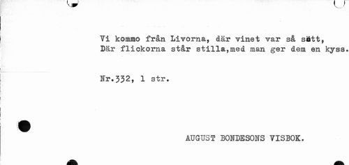 //// Yi kommo från Livorna, där vinet var så sått, Där flickorna står stilla,med man ger dem en kyss. //// Nr.332, 1 str, //// ^ AUGUST BONDESOTS YISBOK. ////