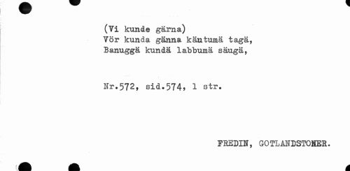 //// (Yi kunde gärna) //// Vör kunda gänna käntumä taga, //// Banuggä kundä labbumä säugä, //// Nr.572, sid.574, 1 str. //// FREDIN, GOTLÅNDSTOHER- ////