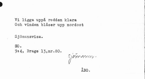 //// I //// Vi ligga uppå redden klara Och vinden blåser upp nordost //// Sjömansvisa. SO. //// 9:4, Brage 13,nr.80. //// d //// ÅBO. //// i ////