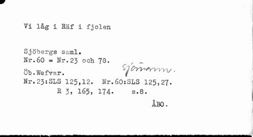 //// i i //// 1 //// 1 //// ? //// Vi låg i Räf i fjolen //// f //// l //// f j //// j | //// Sjöbergs saml» //// Kr.60 = Nr.23 och 73. . - //// Öb. V/ef var. ^^vvvvv. //// Nr.23:SLS 125,12. Nr.60sSLS 125,27. //// R 3, 165, 174- s.8. //// ÅBO. ! //// . | //// tVN i //// .-Äj ////