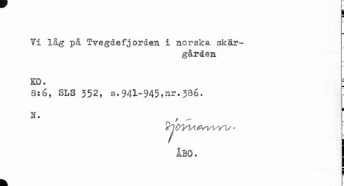 //// j //// Vi låg på Tvegdefjorden i norska skärgården //// KO. j //// 8:6, SLS 352, s.941-945,nr.386. ' //// H- o ' " ¦ //// vyv' //// ÅBO. j //// k - ////