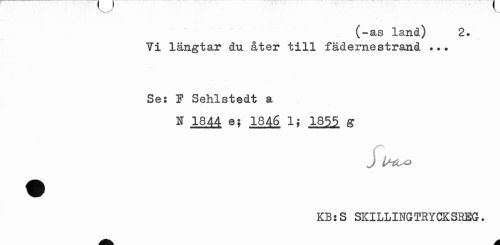 //// (-as land) 2. Yi längtar du åter till fädernestrand ... //// Se: P Sehlstedt a //// N 1844 e; 1846 1; 1855 g //// j IHlsO KB:S SKILLINGTRYCKSREG. ////