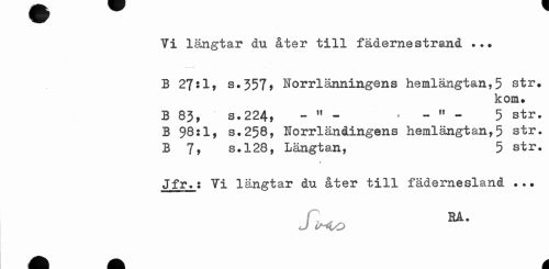 //// Vi längtar du åter till fädernestrand ... //// B 27:1, s.357* Norrlänningens hemlängtan,5 str. //// kom. //// B 83, s.224, - " - * - 11 - 5 str. //// B 98:1, S.258, Norrländingens hemlängtan,5 str. B 7, s.128, Längtan, 5 str. //// 1 //// Jfr.: Vi längtar du åter till fädernesland ... //// BA. //// J ////