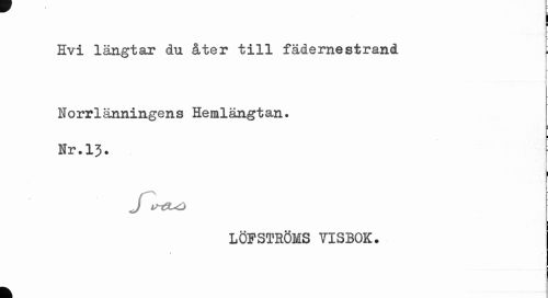 //// I //// I //// Evi längtar du åter till fädernestrand j; //// Norrlänningens Hemlängtan. //// ¦ i //// Nr.13. //// Ji //// J //// LÖFSTEÖMS VISBOK. | //// k ////
