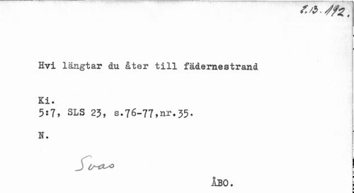 //// i i //// Hvi längtar du åter till fädernestrand Ki. //// 5:7, SLS 23, s.76-77,nr.35. //// N. //// J I //// ÅBO. j //// i ////