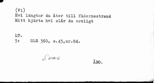 //// (Vi) //// Hvi längtar åu åter till fädernestrand Mitt hjärta hvi slår du oroligt //// i //// LT. //// 5: SLS 360, s.43,nr.84. //// cfwo s //// ÅBO. //// ___V ////