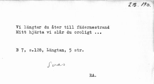 //// I //// Ti längtar du åter till fädernestrand Mitt hjärta vi slår du oroligt . //// B 7> s#128, Längtan, 5 str. //// J //// RA. ////