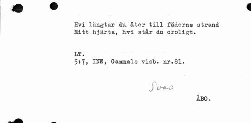 //// Hvi längtar du åter till fäderne strand Mitt hjärta, hvi står du oroligt. //// LT. //// 5:7> INE, Gammals visb. nr#81. //// s //// J W-O //// ÅBO. ////