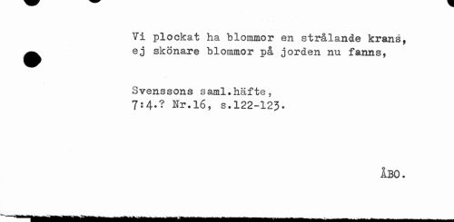 //// Yi plockat ha blommor en strålande kranö, ^^ ej skönare blommor på jorden nu fanns, //// Svenssons saml.häfte, //// 7:4.? Hr.16, s.122-123. //// ÅBO. ////