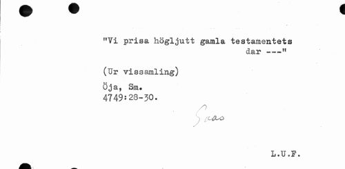 //// "Vi prisa högljutt gamla testamentets //// dar " //// (Ur vissamling) //// Öja, Sm. 4749:23-JO. //// /O //// t //// L.U.F. ////