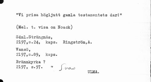 //// "Ti prisa högljutt gamla testamentets dar!" //// (Mel. t. visa om Noack) 3dml.Strängnäs, //// 2197,s.24, kaps. Ringström,A. Vansö, //// 2197,s.89, kaps. Brännkyrka ? //// 2197, s.97. » //// ULMA. //// Ik ////