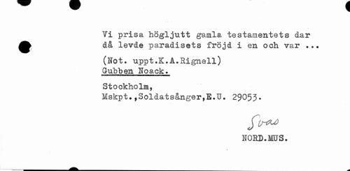 //// \ //// Ti prisa högljutt gamla testamentets dar ^^ då levde paradisets fröjd i en och var //// (Not. uppt.K.A.Rignell) Gubben Noack. //// Stockholm, //// Mskpt.,Soldatsånger,E.U. 29053* //// NORD.MJS. //// i ////