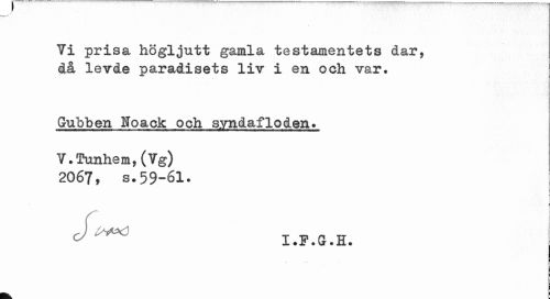 //// Yi prisa högljutt gamla testamentets dar, då levde paradisets liv i en och var. //// Gubben Noack och syndafloden. //// V.Tunhem, (Vg) 2067, s.59-61. //// I i //// v I.P.G.H. //// k. ' ////