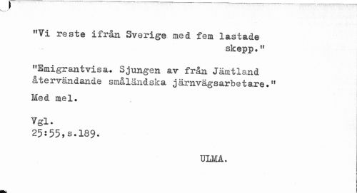 //// f //// t1Vi reste ifrån Sverige med fem lastade //// skepp." //// "Emigrantvisa. Sjungen av från Jämtland återvändande småländska järnvägsarbetare.11 //// Med mel. Vgl. //// 25:55,3.189. //// ULMA. //// ; ////