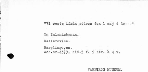 //// "Vi reste ifrån södern den 1 maj i år— //// Om Inlandsbanan. Rallarevisa. Harplinge,sn. //// ^^ Acc.nr.4379» sid.5 f • 9 str. a 4 v. //// VÅRBHRGS MUSEUM. ////
