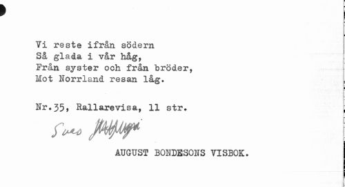 //// > i //// ¦ //// Vi reste ifrån södern Så glada i vår håg, Från syster och från bröder, Mot Norrland resan låg. //// ¦ //// Nr.35, Rallarevisa, 11 str. [ //// jt^r* \ //// AUGUST BONDESOKS VISBOK. ////
