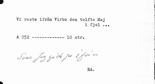 //// k i //// Vi reste ifrån Virbo den tolfte Maj //// i fjol • //// | //// A 252 --- 10 str. //// RÅ. | //// k 1 ////