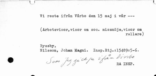 //// Yi reste ifrån Vårbo den 15 i vår--- //// (Arbetsvisor,visor om soc. missnöje,visor om //// rallare) //// Ryssby, //// Nilsson, Johan Magni. Insp.Rtj*:15489*5-6* • ^ a;I1ISP; ////