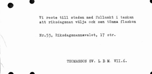 //// Yi reste till staden med fullmakt i taskan att riksdagsman välja ock sen tömma flasken //// Kr.53, Riksdagsmannavalet, 17 str. //// Y //// \ • ' //// \ //// s. //// THOMASSON SV. L D M VII.6. //// \ //// \ //// ^^ ^ A ////