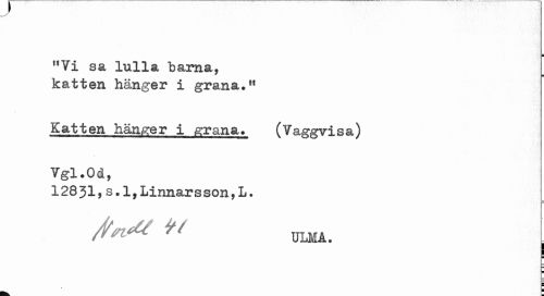//// ¦ //// "Yi sa lulla bama, katten hänger i gr an a.11 //// Katten hänger i grana» (Yaggvisa) Vgl.Od, //// 12831,s.l,Linnarsson,L. //// ULMA. ^ //// ¦ ////