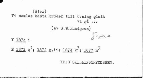 //// (åter) //// Ti sajnlas bästa bröder till övning glatt //// vi gå ••• //// (Av G.W.Sundgren) //// Y 1874- i //// E 1871 q5; 1872 g,ii; 1874 k5; 1877 n5 //// KB:S SKILLINGTRYCK3REG. //// AjA. ^^ ^nJt- ... ... . — .../ ^ ^^^ ////