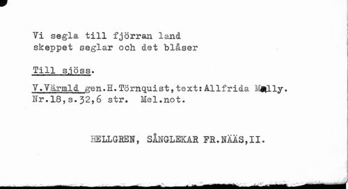 //// Vi segla till fjörraa land skeppet seglar och det blåser //// Till sjöss. //// V.Värmld gen.H*Törnquist,text:Allfrida Mfilly. Nr.18,s.32,6 str. Mel.not. //// BELLGBEI, SÅNGLEKAS FR.NÅAS,II. ////