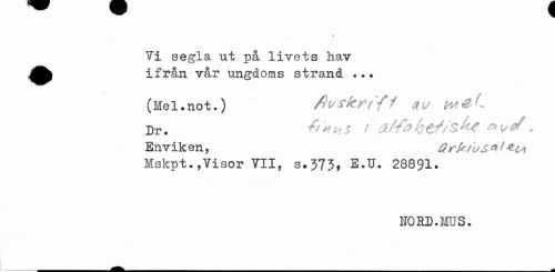 //// \ //// Vi segla ut på livets hav ifrån vår ungdoms strand ... //// (Mel.not.) ftufknYf nu H4&C //// j)Tm finns t ct/faht^i&Kf v //// En vik en, Q rfcii/S ® ^tA //// Mskpt.,Visor VII, s.373, E.U. 28891. //// NORD.MUS. ////