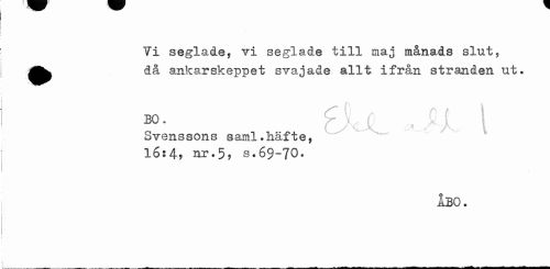 //// Vi seglade, vi seglade till maj månads slut, ^^ då ankarskeppet svajade allt ifrån stranden ut. //// f t t\ t i BO. Y > ; k i I //// Svenssons saml.häfte, //// 16:4, nr.5, s.69-70. //// ÅBO. //// — — _ —— -- - - ___.. __- __—- ~ -- . — - - - - —¦ - - -- ////
