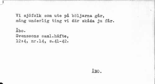 //// / //// m //// Yl sjöfolk som ute på böljarna går, mårig underlig ting vi där skåda ju får. //// Åbo. //// Svenssons saml.häfte, 12:4, nr.14, s.41-42. //// åbo. ////
