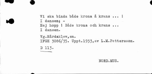 //// Yi ska binda både krona å krans ... i I dansen; - //// Hej hopp l Både krona och krans ... I dansen. //// Yg.Mårdaklev, sn. //// IPGH 3086/35* Uppt.l933,av L.M.Pettersson. D 113. //// NORD. MS. ////