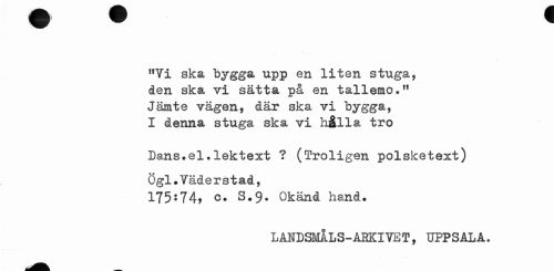//// !fYi ska "bygga upp en liten stuga, den ska vi 3£t"fc "fc SL på en tallemo." Jämte vägen, där ska vi bygga, I denna stuga ska vi hålla tro //// Dans.el.lektext ? (Troligen polsketext) //// Ögl.Väderstad, //// 175:74, c. S.9. Okänd hand. //// LANDSMILS-ÅBEIVET , UPPSALA. ////