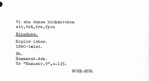 //// } //// Vi ska dansa häckakroken ett,två,tre,fyra //// Ringdans* //// Kopior lekar. 1880-talet. //// Sk. //// Hammar st .Ark. //// Ur ,1Manuskr.9H,s.l45* //// NORD.MUS. ////